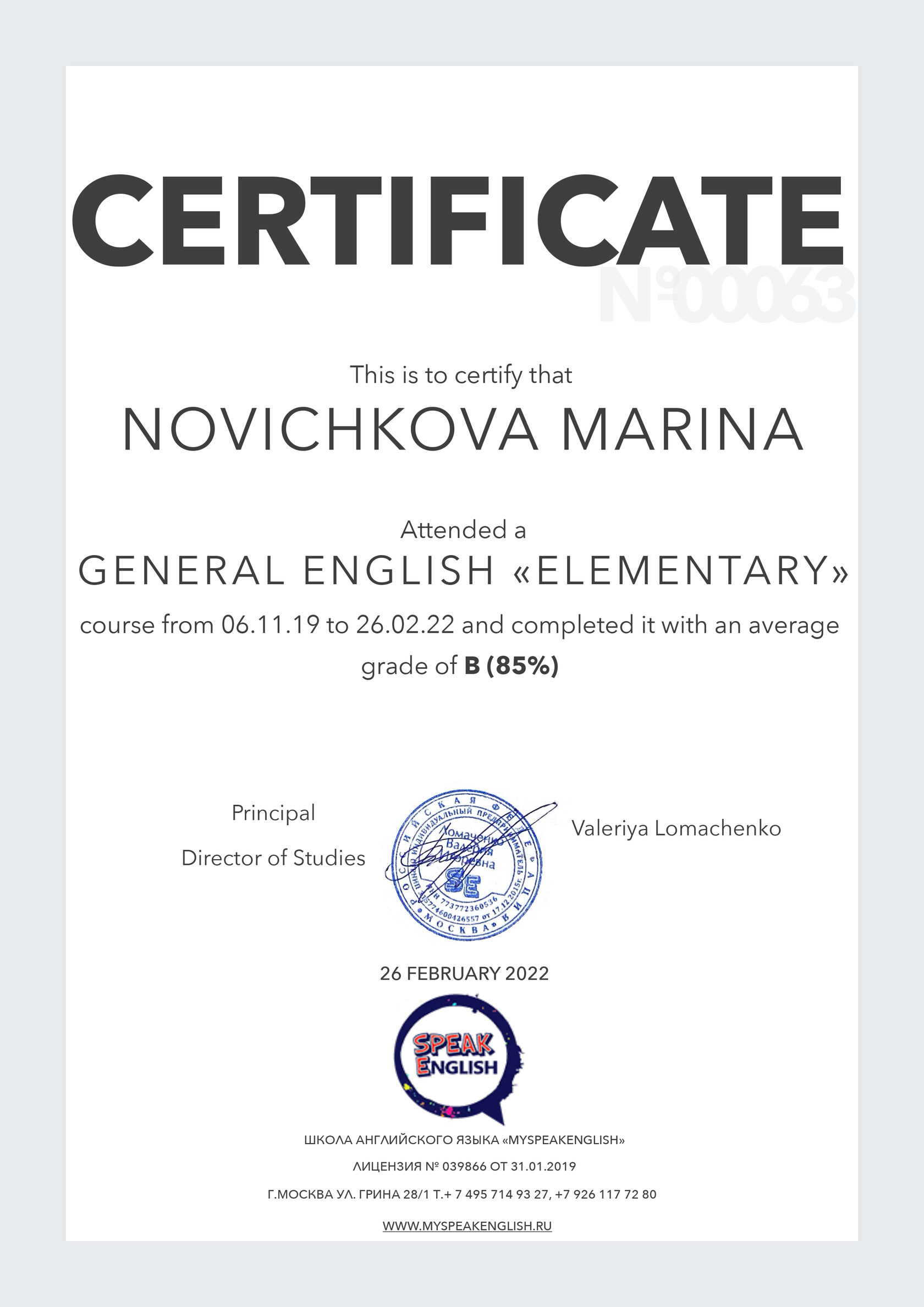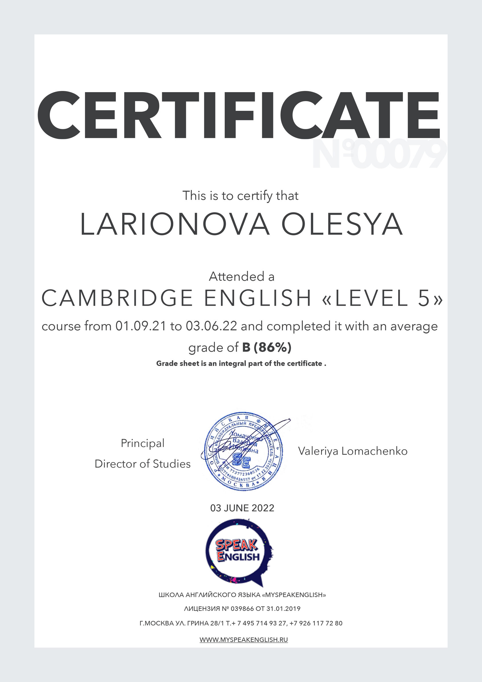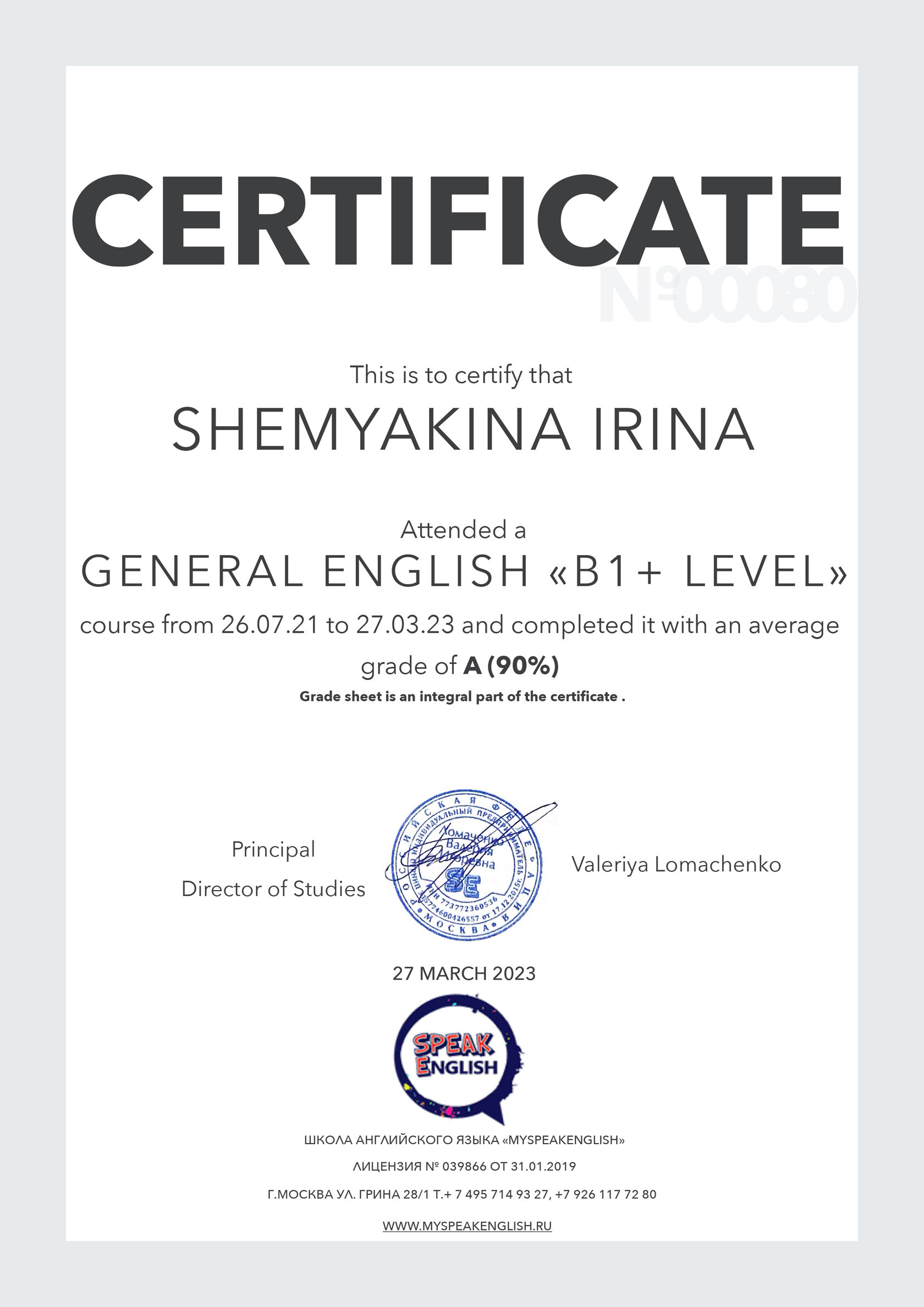 По окончании курса и успешном прохождении тестирования выдаем сертификаты по шкале Европейской системы оценки CEFR